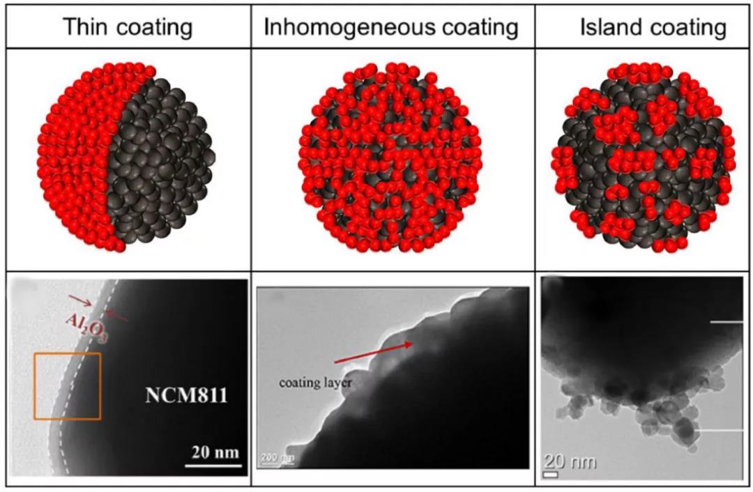 包覆層應均勻且薄。正極顆粒的完全覆蓋將保護正極免受電解質(zhì)侵襲,抑制副反應。此外,薄包覆層能提高界面處的動力學,改善電池性能。