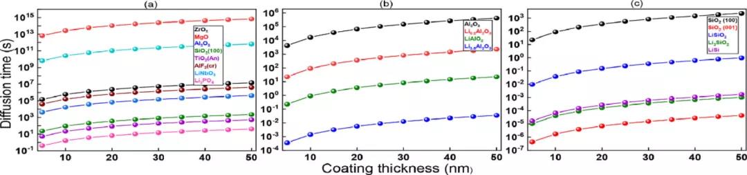 某些表面包覆會阻礙離子擴散,但提供其他優(yōu)勢,而某些包覆可以增強離子擴散,但損害其他性能。在采用包覆時,折衷考慮這些影響一直是電池研究的重點。包覆厚度與包覆層的鋰離子擴散率之間的結(jié)構(gòu)特性相關(guān)性是衡量折衷標準的一個有效方法。圖10提供了擴散時間與包覆厚度的關(guān)系。大多數(shù)氧化物和氟化物的鋰離子擴散率極低。對于較厚的包覆,擴散時間更長。這些表面包覆厚度應小于10nm,以獲得更好的電化學性能。