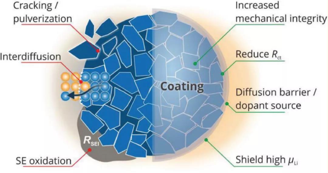 全固態(tài)電池由于高的安全性被認為是電池研發(fā)的重點。但是,固體電解質(zhì)(SE)與正極材料直接接觸時存在不穩(wěn)定問題。當與正極材料直接接觸時,SE易氧化,形成電阻性界面并增加電池阻抗,導致容量快速衰減。SSB中也需要正極材料表面包覆,抑制這些氧化反應。因此,SSB正極材料需要電絕緣和離子導電的表面包覆層。