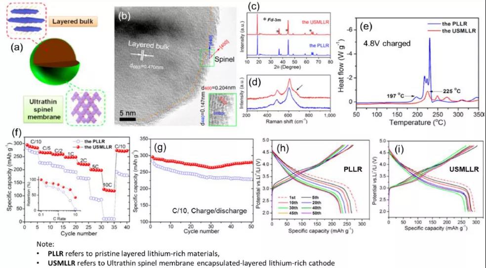 電極材料已被用作正極包覆材料。通常,應將較穩(wěn)定的材料涂覆在較不穩(wěn)定的材料上,以提高材料的整體穩(wěn)定性和性能。好處在于,它們在正極和電解質(zhì)之間提供了物理阻擋層,抑制了副反應,改善了電荷轉(zhuǎn)移動力學,使正極材料具有更好的電化學性能。然而,很難實現(xiàn)均勻且薄的電極材料包覆。而且,需要較高的熱處理溫度以形成良好的包覆,可能導致正極材料分解。對于這類包覆,需要選擇最佳的包覆材料和包覆條件。例如,超薄尖晶石(LiMn2O4)包覆的富鋰Li1.2Mn0.6Ni0.2O2層狀氧化物(USMLLR)改善了電化學和熱性能。好處是既保證了富鋰層狀氧化物材料的高容量又提供了較高的倍率性能,同時由于LMO優(yōu)異的Li+電導率而改善了表面處的電荷傳輸。