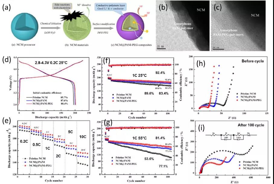 導電聚合物包覆可以形成具有高電子電導率的均勻薄膜,改善正極/電解質(zhì)界面的電荷轉(zhuǎn)移。這類聚合物可以適應體積變化,減少裂紋形成。圖8顯示PANI-PEG包覆的LiNi0.8Co0.1Mn0.1O2(NCM-811)。PANI-PEG具有高離子電導率和電子電導率。倍率性能提高可歸因于電子電導率和電荷轉(zhuǎn)移的提高。循環(huán)性能也有所提高,歸因于副反應被抑制。