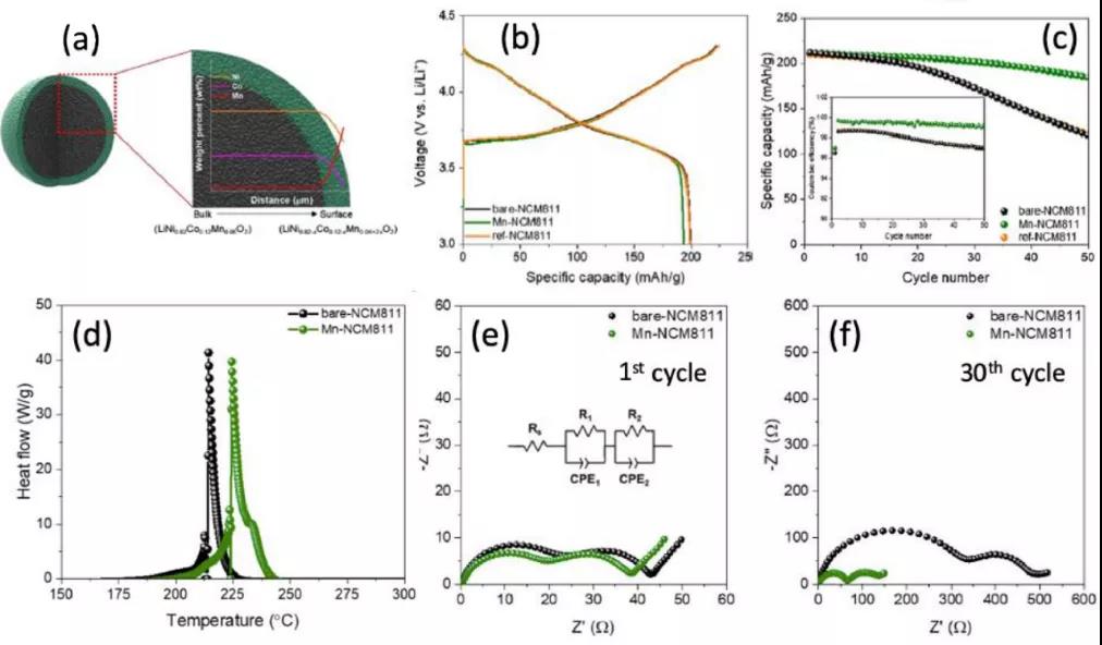 表面包覆方法是在正極表面形成物理阻擋層,通常對電解質(zhì)的反應性較小,因此改善了材料的結(jié)構(gòu)和熱穩(wěn)定性。由于晶體結(jié)構(gòu)以及界面處的成分變化是相似的,表面摻雜不會阻礙Li+擴散,降低了Rct以及界面處的機械應力,減少了開裂的可能。圖9顯示了錳表面摻雜的富鎳正極。富錳層通過抑制副反應有效穩(wěn)定了富鎳表面,最終改善了熱,結(jié)構(gòu)和電化學性能。新形成的表面穩(wěn)定性高,同時保持了高離子傳輸性能。